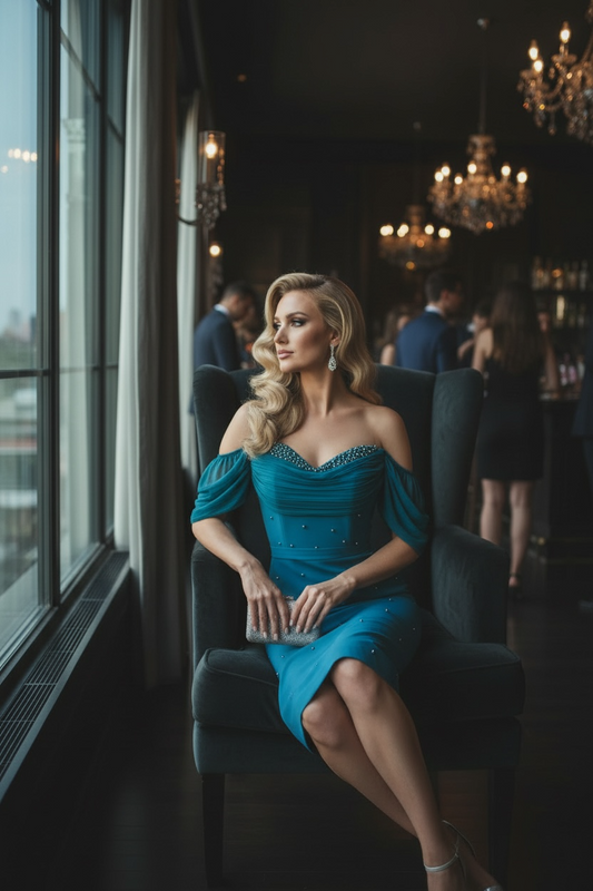 AanbiedingBlauwgroene kokerjurk op knielengte