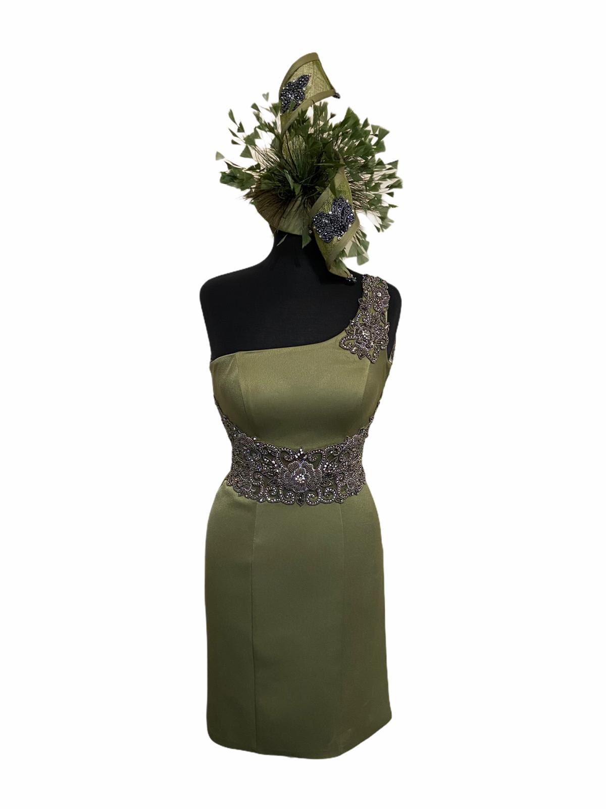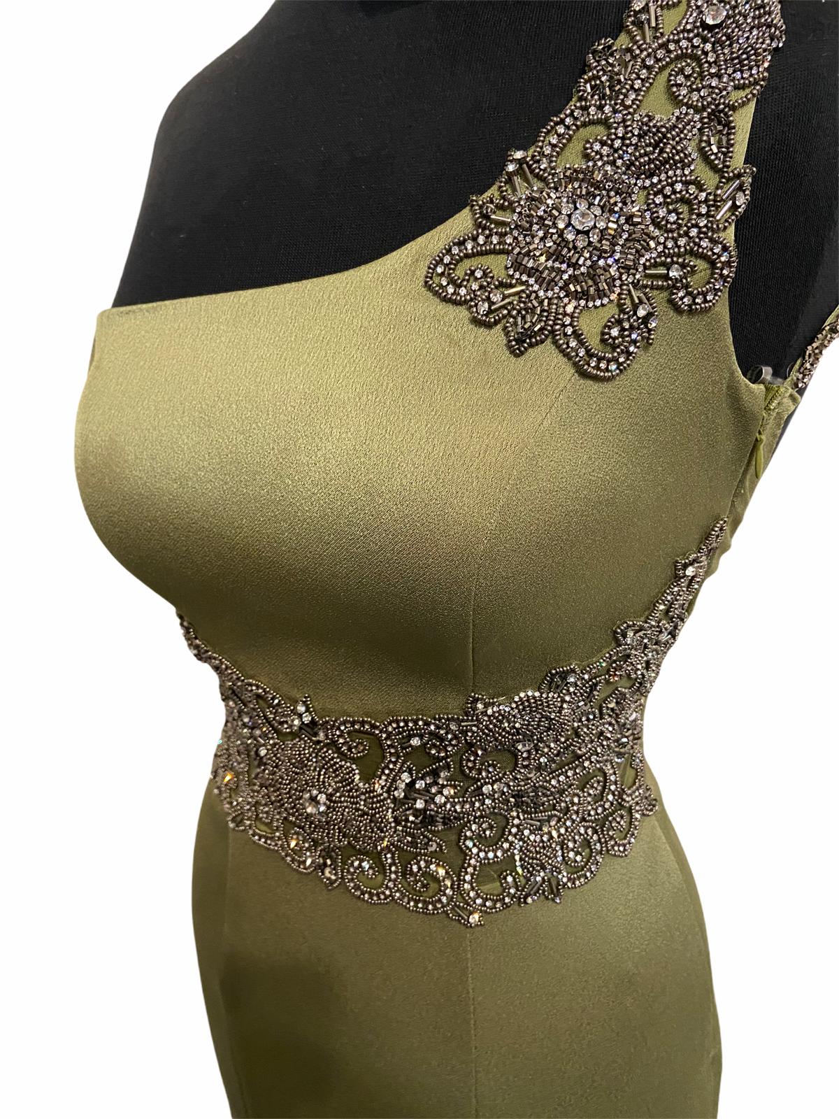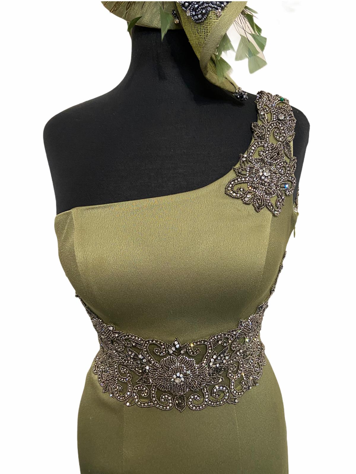 De OLIVE-jurk heeft een diepgroene tint, gemaakt van zijdeachtig luxe materiaal in een getailleerd silhouet met één arm. De zware zilveren kristallen versieringen op de arm en taille en de touwtjes aan de achterkant maken deze jurk werkelijk schitterend.